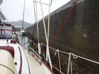 身にしみました。2時少し前に周参見に着く,大潮なので岸壁高く干満差が2m近くある、最干時にはデッキから岸壁まで2m50近くあり上陸出来ません、写
